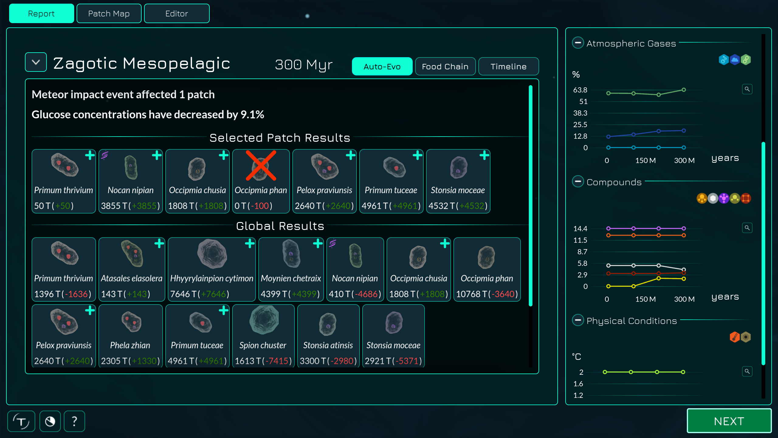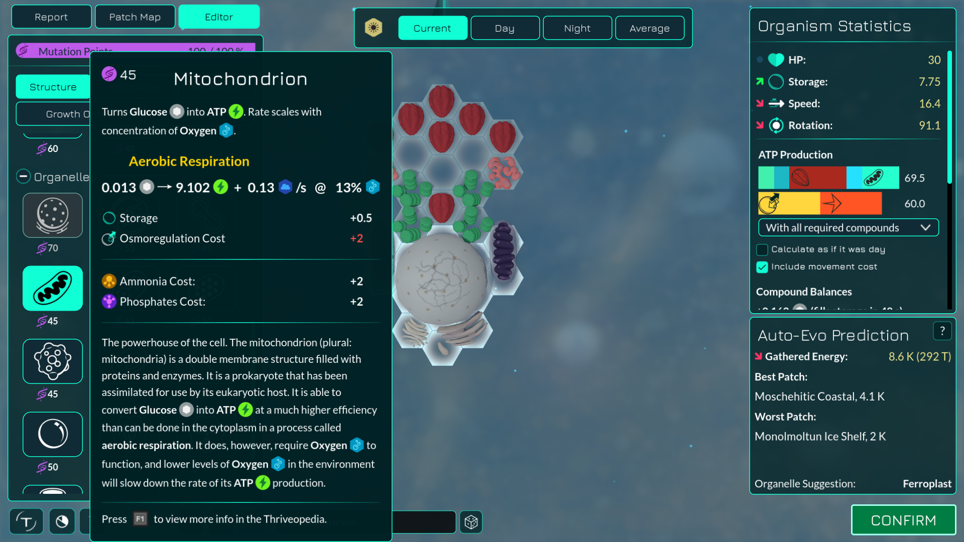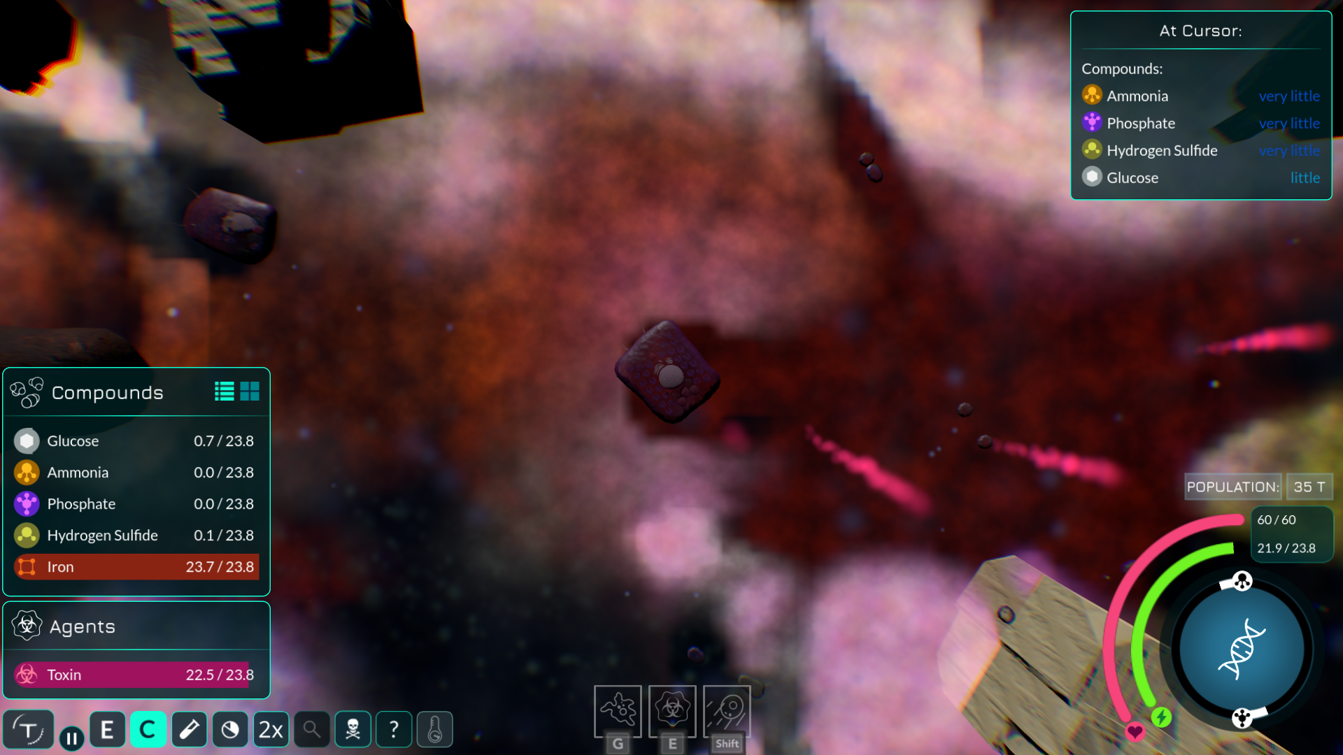 In the time since version 0.9.0, we’ve mainly been focused on fixes, adjustments and balancing to make this release the best it could be. But that still included some more notable features. This includes: new map events to mix up compound amounts, a visualisation of your population on the patch map, a slight re-work of the functioning of the pilus and more of each species’ characteristics being taken into account by our auto-evo system. Graphically, a big bug was fixed that made all our release versions less bright than intended, and improvements to the visuals of the terrain chunks.